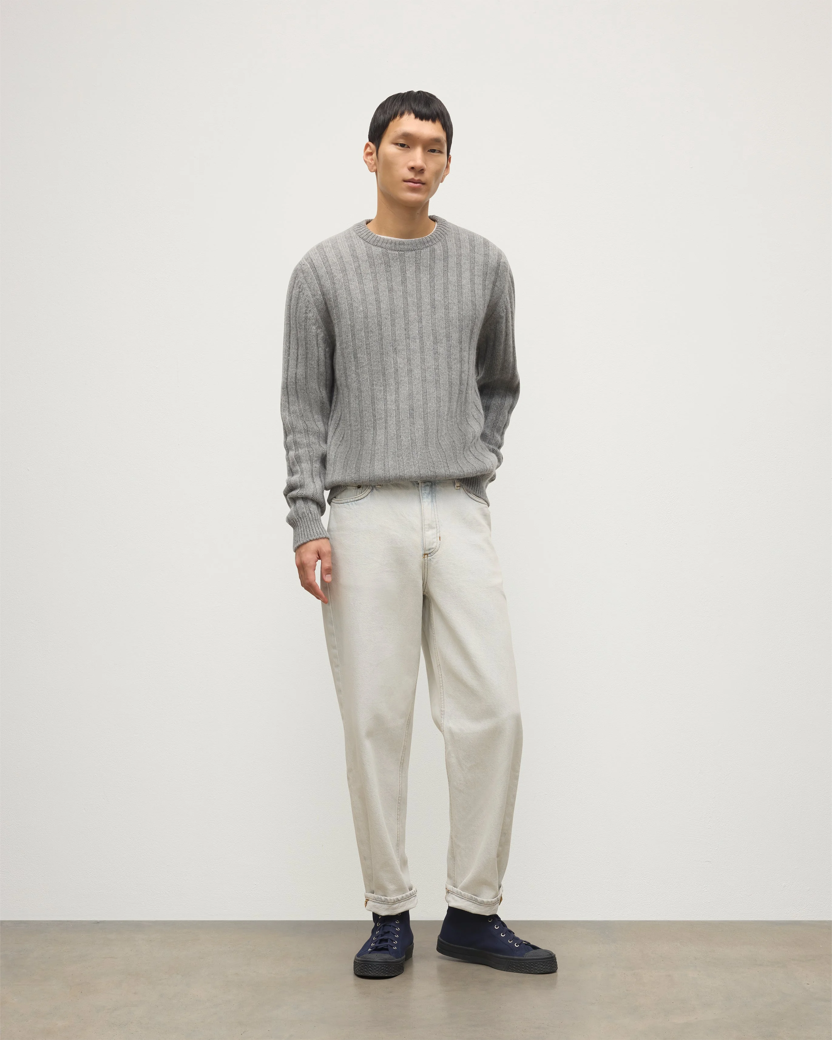 The Peel Cashmere Jumper in a classic Storm Grey is a relaxed wardrobe staple with a ribbed crew neckline, hem and cuffs, and a flat rib design to the body which adds tonal texture. An easy, laid-back style. Knitted in Scotland from an 8-ply 100% cashmere, this jumper combines exceptional softness with natural breathability. PRODUCT DETAILS 100% Cashmere in Storm Grey 8 Ply: Eight individual strands are twisted to create this yarn, producing a durable, medium-thick knit. Model is 6ft1 / 187cm and wears a size M Made in Scotland Code: KAC05751
