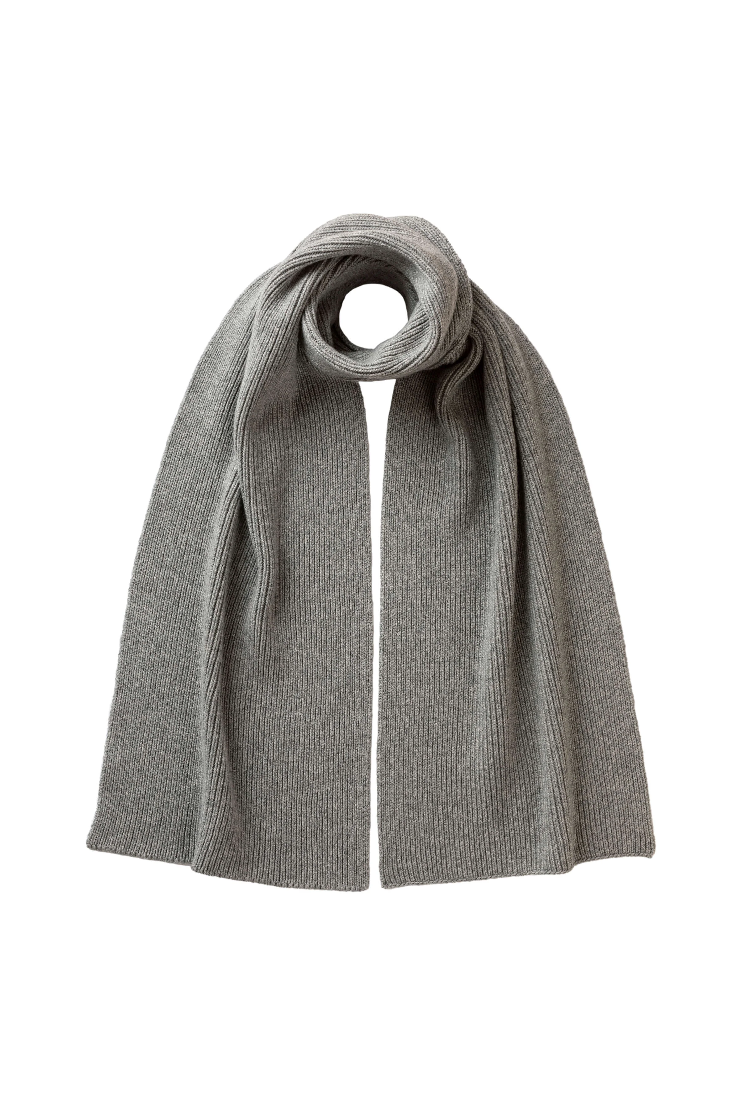 Crafted from the finest cashmere, this light grey scarf blends timeless design with exceptional softness. Featuring a classic ribbed knit and made in our own Scottish Borders mill, it's a versatile piece designed to elevate any wardrobe. Effortlessly stylish, endlessly wearable. PRODUCT DETAILS 100% Cashmere 175x30cm | 68x11" 4 Ply: Four individual strands are twisted to create this yarn, producing a durable, light-mid knit. Made in Scotland Code: HAC03537