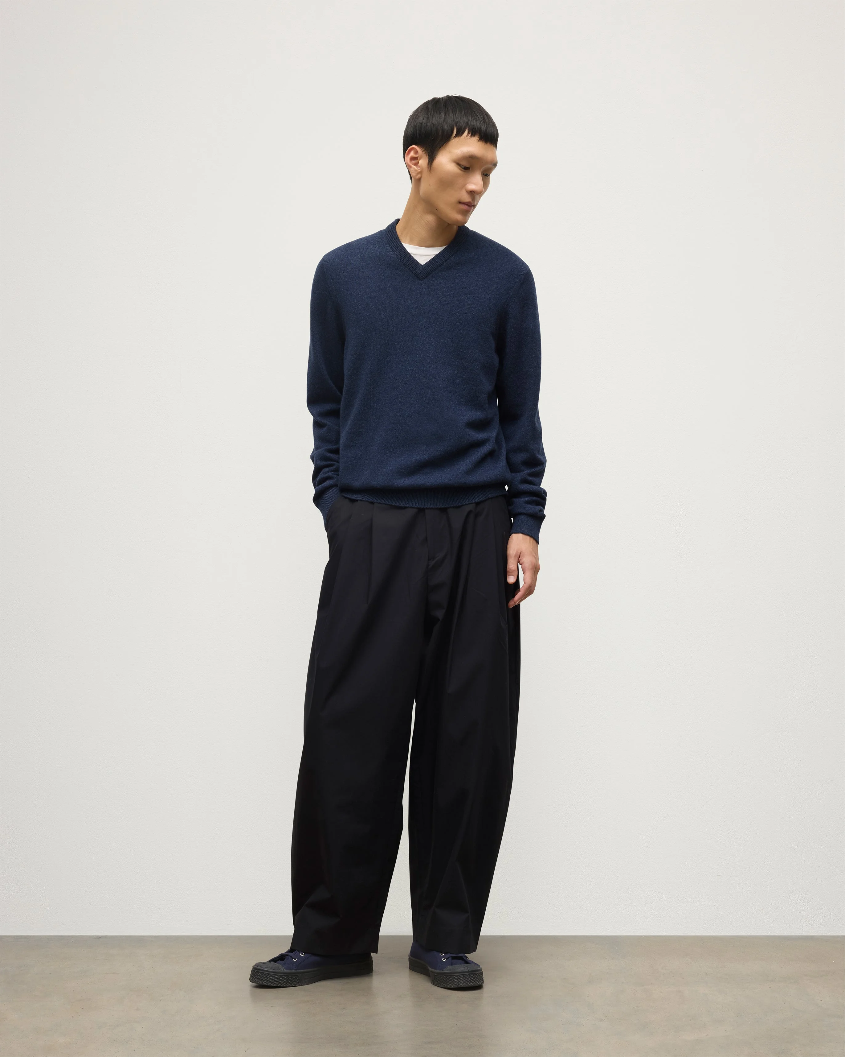 A relaxed, easy fit makes the Rory V neck a perfect year-round layering piece. Crafted from soft, tactile cashmere this style works perfectly with a tailored pant and shirt for a classic chic look or equally well with denim for a laid-back everyday staple. PRODUCT DETAILS 100% Cashmere in Barra Navy Model is 6ft1 / 187cm and wears a size M Made in Scotland Code: KAP05594