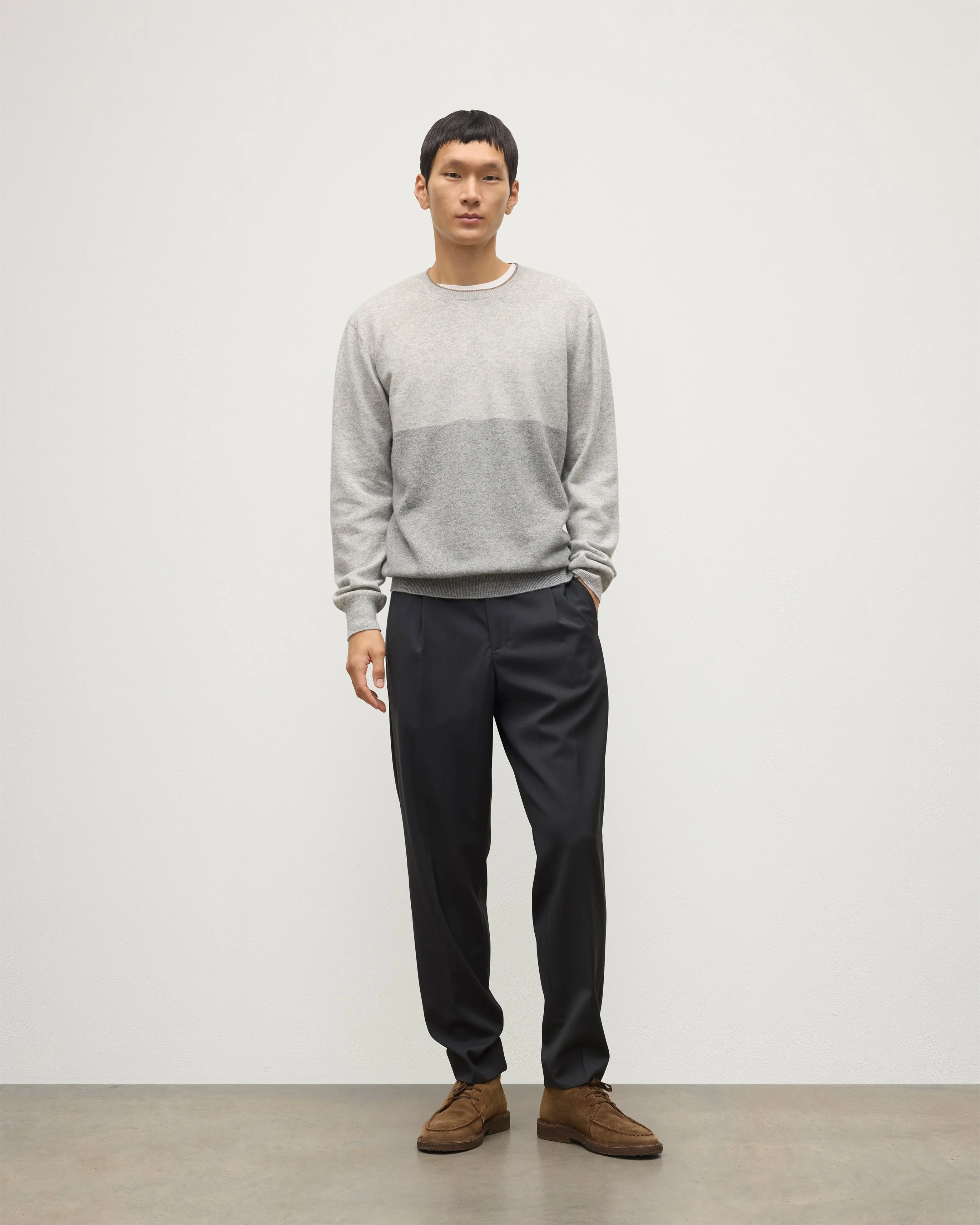 Sophisticated two-tone crew neck sweater with added contrast tipping on the neckline. Knitted in lightweight 2 ply cashmere this elevated twist on a classic with its subtle colour pairings is the perfect wardrobe update. PRODUCT DETAILS 100% Cashmere in Light Grey 2 Ply: Two individual strands are twisted to create this yarn, producing a durable, lightweight knit. Oversized Fit Made in Scotland Code: KAI05232