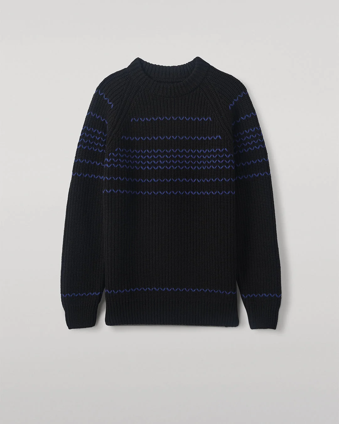 Traditional half-cardigan rib crew-neck sweater with a generous raglan silhouette knitted in 8-ply cashmere. Beautifully detailed with placed overstitch herringbone stripes in a subtle, unusual colour contrast. PRODUCT DETAILS 100% Cashmere in 8 Ply: Eight individual strands are twisted to create this yarn, producing a durable, medium-thick knit. Model is 6ft1 / 187cm and wears a size M Made in Scotland Code: KAC05752