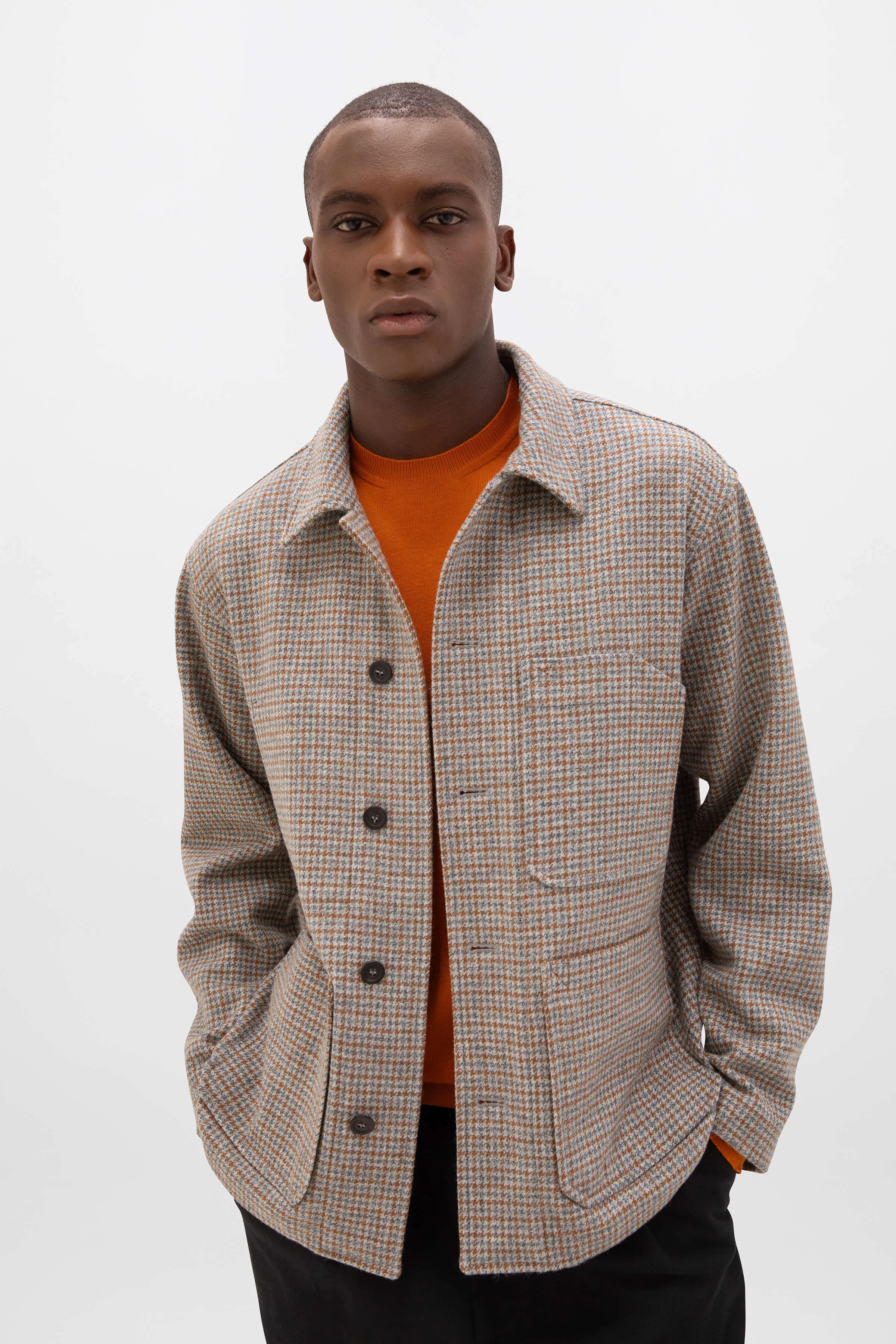 A traditional workwear inspired piece with a simple unlined construction. As makers, we are delighted to share this mastery of fabric. Features a pocket for scissors and a little slot for essential weaving tools - a heddle hook and a dropper. The main outer pockets have double entry, side entry and top entry leading into separate compartments, lined with hardwearing cotton cloth and reinforced with substantial bar tacks. The breast pocket is split for convenience while two internal pockets can house more personal belongings. The Weavers Jacket has dropped shoulders for a soft, relaxed fit, and a silhouette that finishes at the hip. Melange wool offers depth of colour, strengthened for durability by twisting worsted wool around it. This has the same base fabric as our Tweed Jacket but the unlined construction of the Weavers Jacket allows for a less formal aesthetic. Boasts an understated Gun Club check in versatile shades of grey and camel. PRODUCT DETAILS 100% Wool Model is 6ft2 and wear a size 40 Made in Scotland Code: TD000429