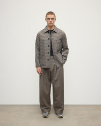 Inspired by traditional workwear, the Weavers Jacket is a practical and characterful layer, designed with makers in mind. Cut from our Storm Heritage Gun Club cloth, it offers a relaxed silhouette with a soft, unstructured feel. Thoughtfully detailed, the jacket features a scissor pocket and dedicated slots for a heddle hook and dropper. Double-entry lower pockets provide both top and side access to separate compartments, lined in durable cotton and reinforced with bar tacks. A split breast pocket adds function, while two internal pockets keep personal items secure. With dropped shoulders and a hip-length cut, it’s a versatile, unlined piece that bridges utility and craft with ease. PRODUCT DETAILS 100% Wool Model is 6ft2 and wear a size 38 Style details: • Unlined with flat felled seams. • Split breast pocket gives versatility for use. • 2 main outer pockets have double entry. • Internal pocket for valuables • Back yoke construction. • Drop shoulder to give a softer, relaxed fit. • Shirt collar and centre front button fastening, buffalo horn buttons. Made in Scotland Code: TD000477