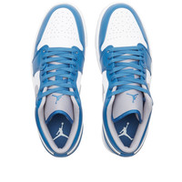 Taking inspiration from the original shoe that debuted in the mid 80s, the Air Jordan 1 Low is made to a low top bold style with a white, grey and blue colourway. The heel of the sneaker showcases the brand’s original logo of the wings, the side of the sneakers features the Swoosh branding as a matching overlay. - Leather Uppers - Leather Overlays - Perforated Toe Box - Tongue Branding - Embroidered Branding - Rubber Outsole