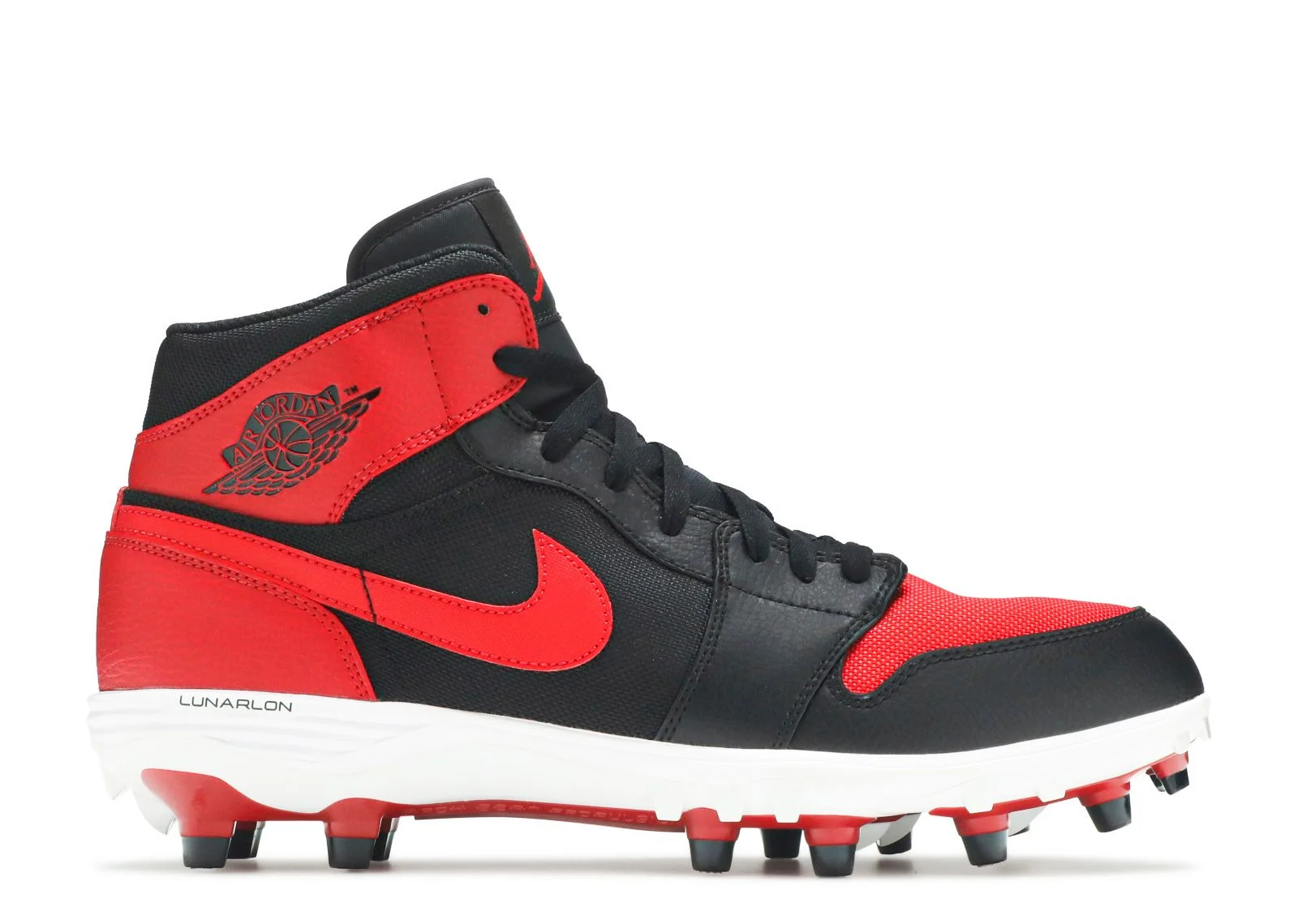 The Jordan 1 Mid TD 'Bred' brings a familiar Chicago Bulls look to the gridiron. Reimagining Michael Jordan's first signature shoe as a football cleat, the synthetic and textile upper features a familiar mix of black and Varsity Red. The upper maintains the usual branding, while underfoot, a contrasting white Lunarlon midsole is included for cushioning. The outsole sports black and Varsity Red rubber studs for traction. SKU: AR5604 061 Colorway: Black/Varsity Red-White-Varsity Red Release Date: 3/24/19