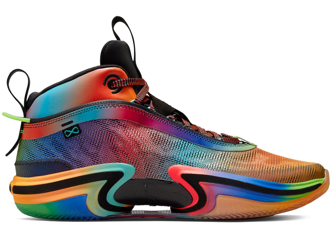 The Air Jordan 36 Year of the Tiger Rainbow is a limited edition sneaker that celebrates the Chinese zodiac sign of the tiger. The shoe features a vibrant rainbow colorway with tiger stripes on the upper, as well as a translucent outsole with a tiger graphic. The upper is made of a mix of synthetic materials and mesh for breathability, while the midsole is equipped with Zoom Air cushioning for a comfortable ride. The shoe also includes a unique lace toggle system for a secure fit. The Air Jordan 36 Year of the Tiger Rainbow was released on June 24th, 2022, with a retail price of $180. Don't miss out on this eye-catching and stylish sneaker. - Style DN4200-064 - Colorway Black/Flash Crimson-Racer Blue-Aurora Green-Laser Orange - Retail Price 180 - Release Date 2022-06-24 - Featured false