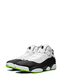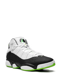 Jordan 6 Rings "Altitude Green" sneakers The iconic Jordan 6 Rings now arrive in white, black, grey and green colourway. This high-top sneaker is crafted from leather, highlighted with a Jumpman logo at the rear and tongue, and sits atop a rubber sole for comfort and traction. Highlights - Black/white - Signature jumpman motif - Contrasting panel detail - Round toe - Front lace-up fastening - Logo patch at the tongue - Side touch-strap fastening - Pull-tab at the heel - Branded insole - Rubber sole - These styles are supplied by a premium sneaker marketplace. stocking only the most sought-after footwear, they source and curate some of the most hard to find sneakers from around the world. Imported Composition Sole: Rubber 100% Outer: Fabric 100% Lining: Fabric 100%
