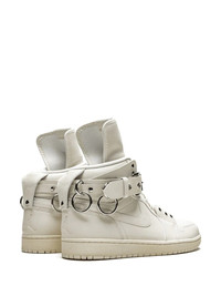 x Comme Des Garcons Air Jordan 1 High "White" sneakers The COMME des Garcons x Air Jordan 1 High “White” is one of two colourways of the renowned fashion house’s bold spin on the Air Jordan 1. Coming off the heels of a string of notable collaborative efforts between the Japanese label and Nike in 2018, CDG returns with an ode to biker culture for their first release with Air Jordan. The iconic Jordan 1 is transformed with a monochromatic premium white leather upper adorned with chrome buckles, rivets, and silver O-rings reminiscent of punk and goth aesthetics. An extra high tongue, belt-like ankle strap, and silver studs comprise the details exclusive to this collaboration. Highlights - White - Leather - A round toe - An oversize tongue - A lace up detail - A side buckle fastening - A ridged rubber sole - Hanging metal rings - Supplied by a premier sneaker marketplace dealing with unworn, already sold out, in demand rarities. each product is rigorously inspected by experienced experts guaranteeing authenticity. Imported Composition Calf Leather 100%