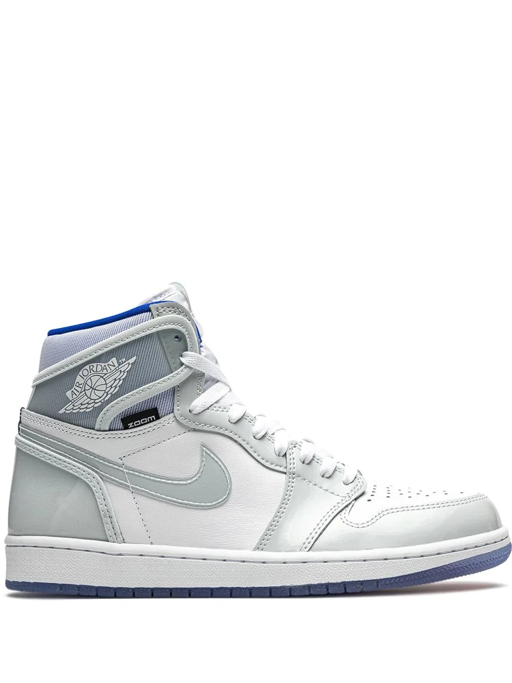 Air Jordan 1 High Zoom "Racer Blue" sneakers Nothing says timeless quite like a pair of Jordans. Perfect for on or off the court, these Air Jordan 1 High Zoom race blue feature a highly-sought after silhouette that has been around for years. Crafted from white and racer blue leather, the high-top pair are sure to set your heart on the prize. Highlights - White/racer blue - Canvas/rubber - Round toe - Flat rubber sole - Front lace up fastening - Signature swoosh logo detail - These styles are supplied by a premium sneaker marketplace. stocking only the most sought-after footwear, they source and curate some of the most hard to find sneakers from around the world. Imported Composition Calf Leather 100% SIZE & FIT FittingInformation This piece fits small – take one size up