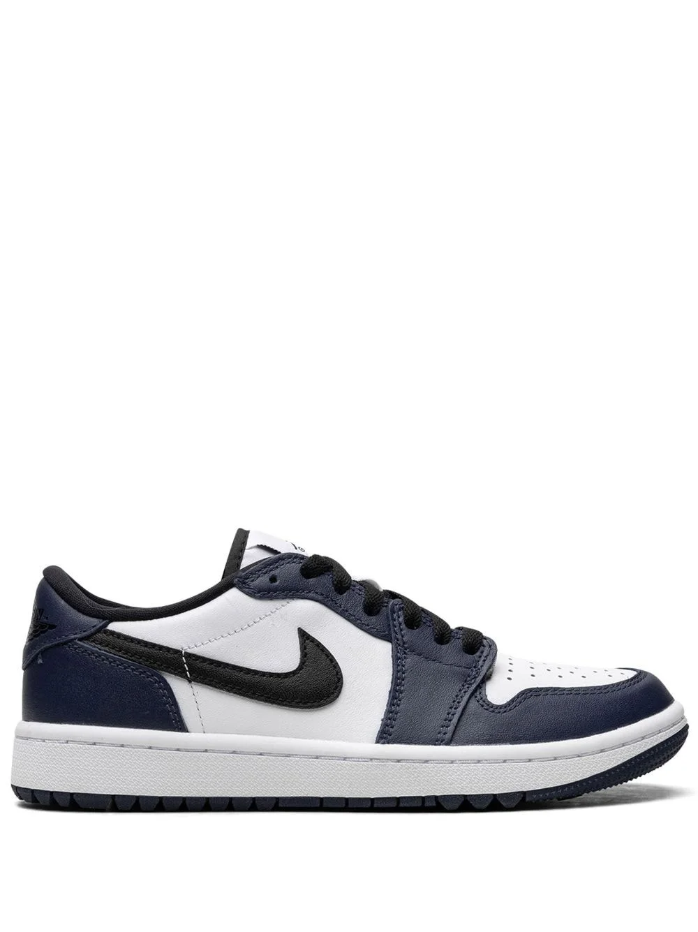 Air Jordan 1 Low G "Midnight Navy" sneakers Released in 1985, the Air Jordan 1 Low sneaker is characterised by its signature branding and bold colour-block design. This iteration comes in black, white and navy blue. The 'NIKE AIR' branding on the tongue has been substituted with the iconic Jumpman logo, while the Wings insignia accents the heel counter. Highlights - Black/white/navy blue - Leather - Signature swoosh logo detail - Signature air jordan wings logo - Round toe - Signature jumpman logo patch at the tongue - Front lace-up fastening - Flat rubber sole - These styles are supplied by a premium sneaker marketplace. stocking only the most sought-after footwear, they source and curate some of the most hard to find sneakers from around the world. Imported Composition Leather 100%