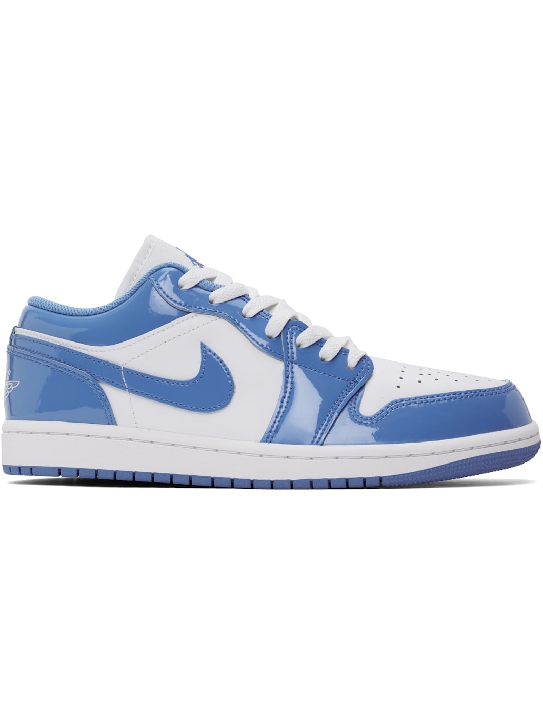 Low-top patent leather and buffed faux-leather sneakers in white and blue. · Perforated detailing at toe · Lace-up closure · Logo embroidered at padded tongue · Padded collar · Swoosh applique at sides · Logo embroidered at heel counter · Mesh lining · Air sole unit at midsole · Treaded rubber sole Please note that this item may be shipped only within North America. Supplier color: White/Legend blue