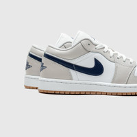 - 553558 146 - White/Midnight Navy-Neutral Grey - Low-cut iteration of the iconic Air Jordan 1 - White leather upper - Neutral grey leather overlay - White nylon tongue with embroidered "JUMPMAN" logo - Midnight navy leather swoosh - Neutral grey leather heel panel with embroidered "WINGS" branding - White rubber midsole - Gum rubber outsole