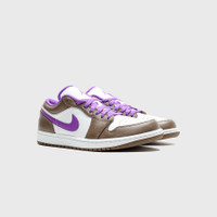 - 553558 215 - Palomino/Wild Berry-White - Low-cut iteration of the iconic Air Jordan 1 done in a brand new colorway - Palomino & white leather upper with white leather toe box - White nylon tongue - Wildberry leather swoosh - Palomino leather heel panel & collar - Embroidered "JUMPMAN" logo on tongue - Embroidered "WINGS" branding on the heel - White rubber midsole - Palomino rubber outsole