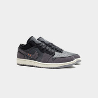 - DN1635 001 - Black/Cement Grey-Lt Graphite-Sail - Low cut iteration of the iconic Air Jordan 1 done with some special materials - Light graphite suede upper with black leather toe box & black suede heel collar - Black canvas tongue with embroidered "JUMPMAN" logo with unfinished edges - Light graphite suede swoosh with orange accents - Light graphite suede heel panel with embroidered Jordan "WINGS" logo - Light graphite nylon canvas mesh mid panel - Exposed edge collar - Sail rubber midsole - Cement grey rubber outsole - Extra pair of laces