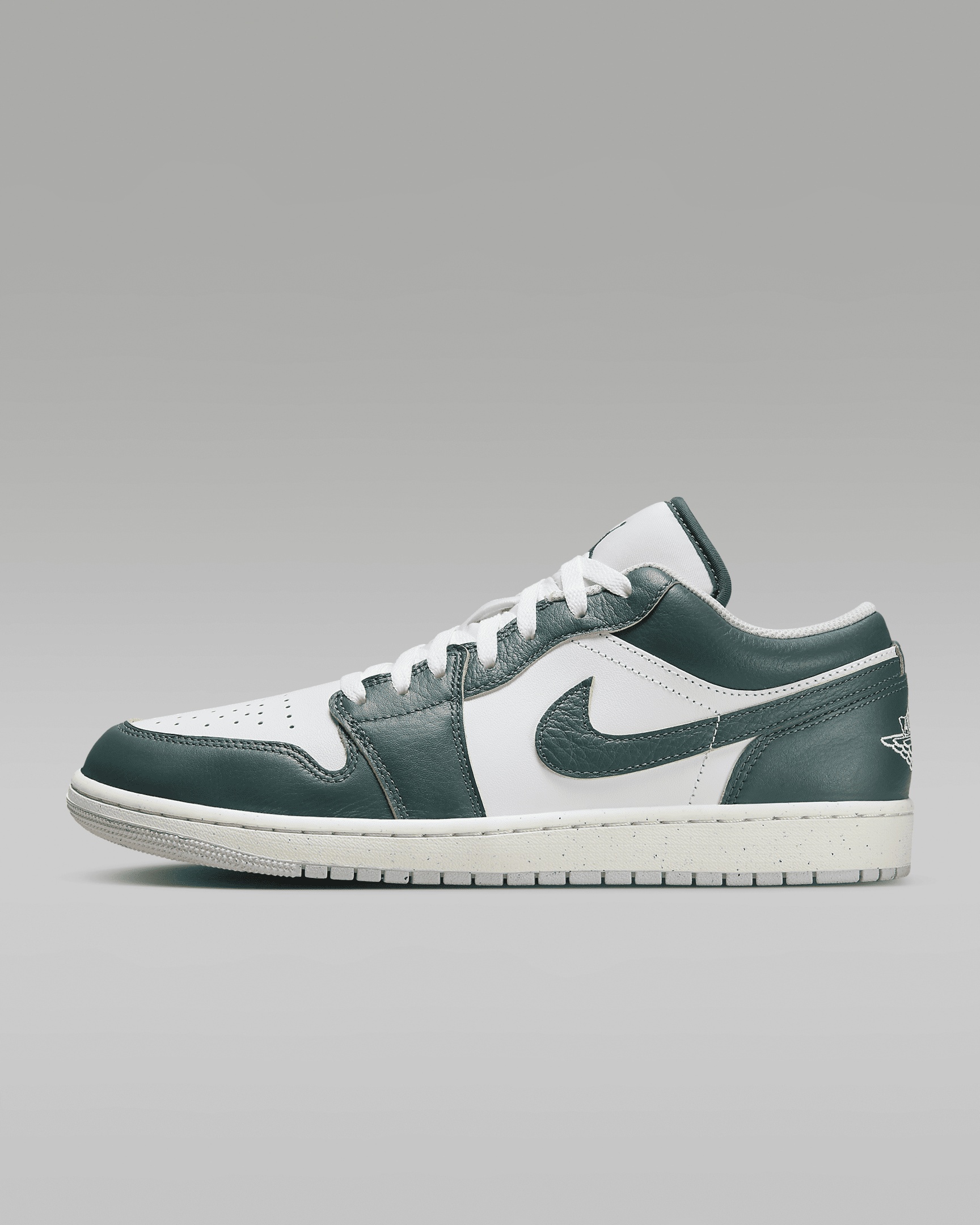 Smooth. Sleek. Solid. The AJ1 Low brings you a clean, classic look that's familiar and always fresh. Nike Air cushioning keeps every step comfortable. Full-grain leather lends a premium feel to ensure your 'fit is always on point. Benefits - Genuine leather in the upper offers durability and structure. - Encapsulated Nike Air unit provides lightweight cushioning. - Rubber in the outsole helps give you durable traction that's ideal for everyday wear. Product Details - Wings logo on heel - Jumpman on tongue - Shown: Oxidized Green/White/Sail/Oxidized Green - Style: FQ7687-300
