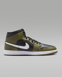Inspired by the original AJ1, this mid-top edition maintains the iconic look you love while choice colors and crisp leather give it a distinct identity. Benefits - Leather, synthetic leather and textile upper for a supportive feel. - Foam midsole and Nike Air cushioning provide lightweight comfort. - Rubber outsole with pivot circle gives you durable traction. Product Details - Shown: Black/Medium Olive/Sail/White - Style: DQ8426-092