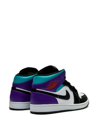 Air Jordan 1 Mid "Aqua" sneakers And Jordan strikes again - in a new colourway. These Air Jordan 1 Mid sneakers feature a black Swoosh logo and a red Wings insignia on the sides, while purple and aqua-green panels stand out at the rear and sides. Underneath, the rubber sole adds comfort to the design. Highlights - Black - White - Purple - Aqua green - Calf leather - Signature swoosh logo detail - Signature air jordan wings logo - Round toe - Front lace-up fastening - Logo patch at the tongue - Branded insole - Rubber sole Imported Composition Sole: Rubber 100% Outer: Calf Leather 100% Lining: Fabric 100%