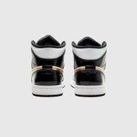 - 852542 007 - Black/Metallic Gold-White - Mid-cut iteration of the iconic Air Jordan 1 - White and black leather upper - Metallic gold leather swoosh - White nylon tongue with"AIR JORDAN" tongue tag - Metallic gold Jordan's "WINGS" logo on the side - White rubber midsole - Black rubber outsole