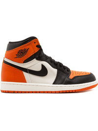 Air Jordan 1 Retro High OG "Shattered Backboard" sneakers Released in 2015, the “Shattered Backboard” Air Jordan 1 High is inspired by an exhibition game Michael Jordan participated in back in 1985 in Trieste, Italy where he broke the glass backboard after a dunk. Constructed in high quality tumbled leather in the original hightop silhouette of the Air Jordan 1, the orange, black, and white colorway is taken from the team uniform MJ wore during the game and modeled after the OG “Black Toe” AJ1 color block. Highly limited upon its initial release, the “Shattered Backboard” Air Jordan 1 disappeared quickly and is now one of the most sought after nonoriginal colorways of the legendary shoe. Imported Composition Calf Leather 100%