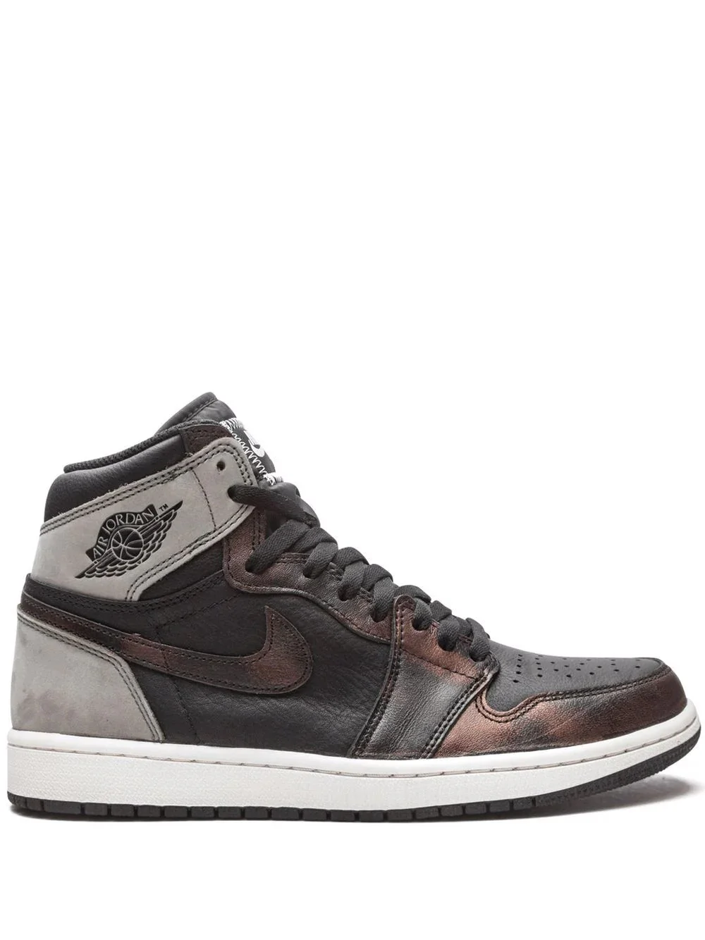 Air Jordan 1 Retro High OG "Patina/Rust Shadow" sneakers These Nike Air Jordan 1 Retro High OG feature a black leather upper with Light Army suede and copper-finished leather overlays. Here, a mint Nike Air logo patch is stitched atop a black nylon tongue, adding a hit of colour to the otherwise earth tone colourway. Underneath, a two-toned rubber sole adds comfort to the design. Highlights - Black/grey - Leather - Signature air jordan wings logo - Signature swoosh logo detail - Distressed effect - Contrasting panel detail - Round toe - Front lace-up fastening - Logo patch at the tongue - Ankle-length - Branded insole - Rubber sole - These styles are supplied by a premium sneaker marketplace. stocking only the most sought-after footwear, they source and curate some of the most hard to find sneakers from around the world. Imported Composition Leather 100%