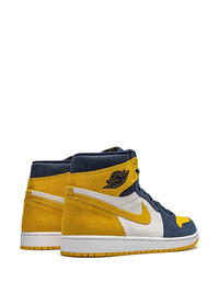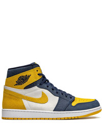 Air Jordan 1 Retro High PE sneakers Get ready to score on and off the court with these Nike Air Jordan 1 Retro High PE sneakers. Made from blue, white and yellow leather, they'll make your feet stand out everywhere you go. Guess we know who the winner is already. Imported Composition Outer: Leather 100%, Fabric 100% Sole: Rubber 100% Lining: Fabric 100%
