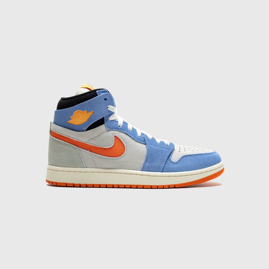- DV1307 184 - Sail/Alpha Orange-Royal Pulse - New materials and tooling update the Vapor Green Air Jordan 1 Zoom CMFT 2 - Light silver suede upper - Royal pulse suede overlays - White canvas nylon tongue with "ZOOM AIR" branding - Alpha orange mesh swoosh and Alpha orange "WINGS" logo - Light silver suede heel wrap with Royal pulse suede collar - Sail rubber midsole - Alpha orange rubber outsole