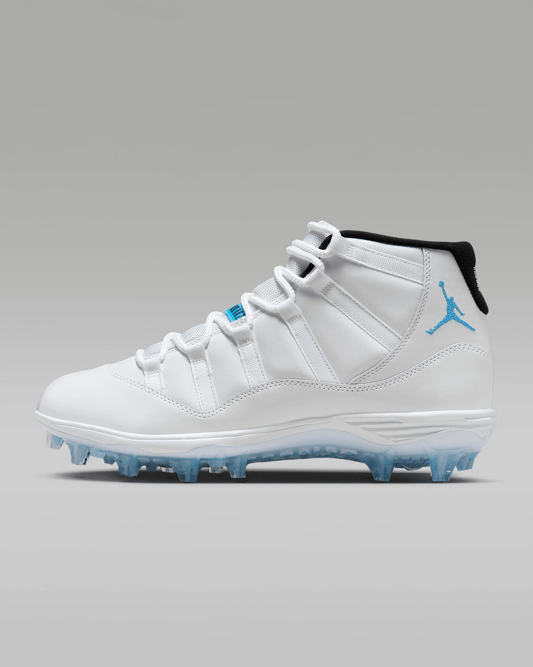 You don't have to worry about looking good in the end zone when you're wearing these Jordan 11 Mid cleats. With molded studs that deliver optimal traction for quick cuts and a durable leather upper for a supportive fit, they bring an iconic design to the field. Benefits - Snappy and responsive, Air Zoom cushioning helps provide a quick-off-the-ground sensation. - Upper takes iconic parts of the AJ11 and reimagines the silhouette for football. - Genuine leather in upper offers durability, structure and a premium look. - Cleated plate offers lightweight, durable traction. Product Details - Shown: White/Black/Legend Blue - Style: HM7324-104