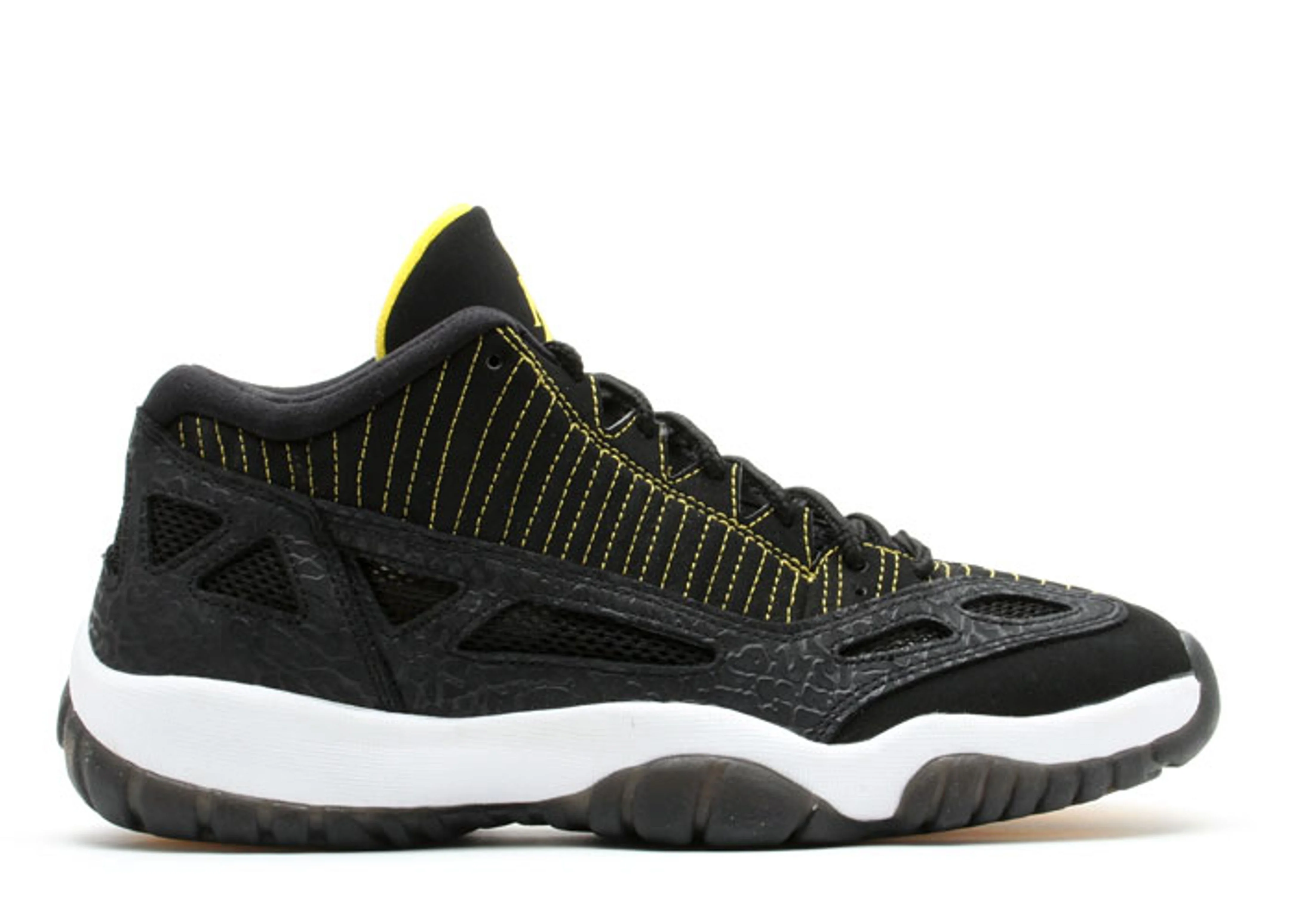 The Air Jordan 11 Retro Low IE ‘Zest’ applies contrast yellow stitching to a blacked out nubuck upper, complemented a with tonal black elephant-print overlay and matching black mesh inserts for added breathability. The low-top rests on a crisp white foam midsole, reinforced by a semi-translucent black rubber outsole that delivers durable traction underfoot. SKU: 306008 002 Colorway: Black/Zest-White Release Date: 6/30/07
