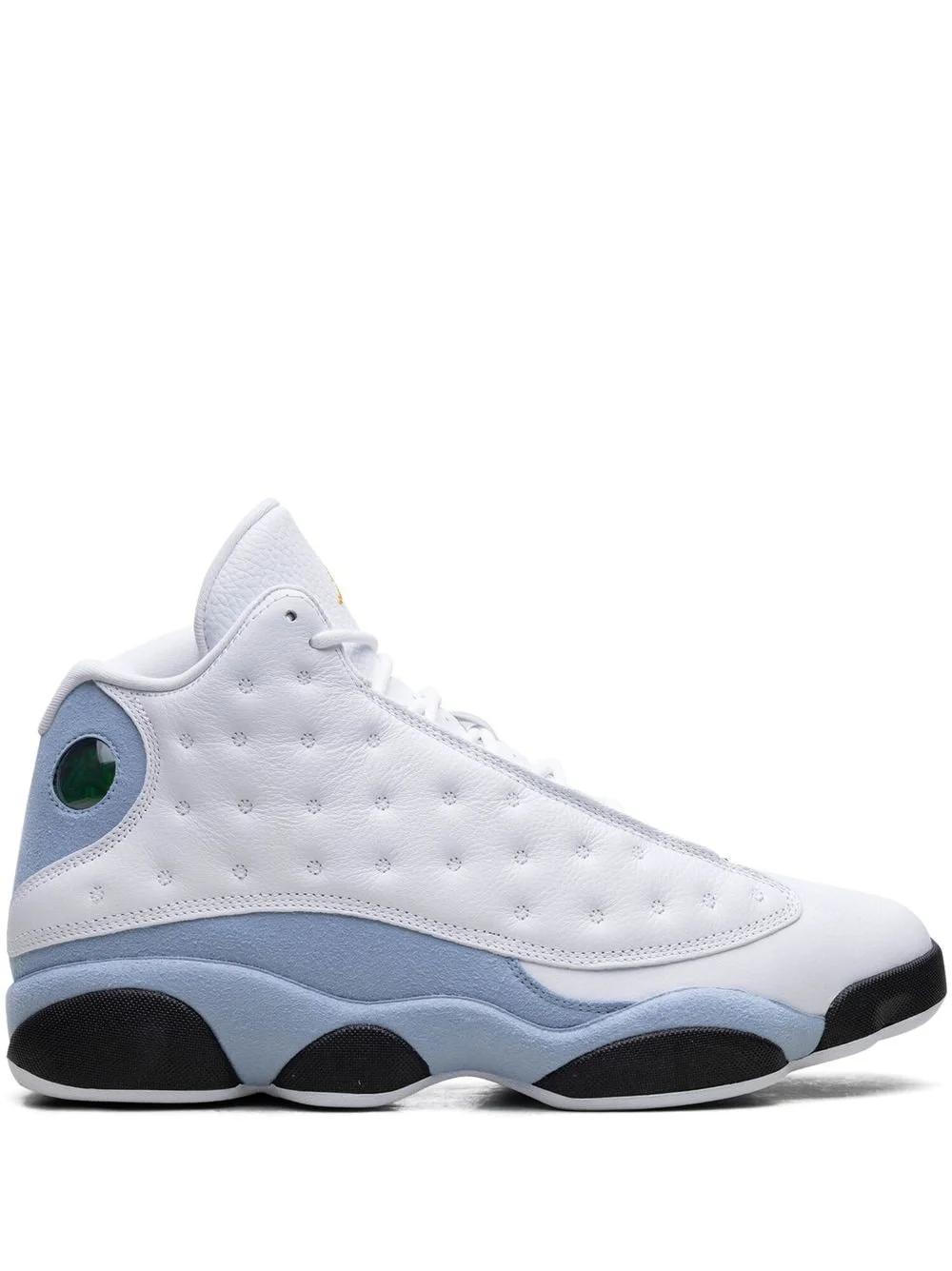 Air Jordan 13 Retro "Blue Grey" sneakers These Air Jordan 13 Retro sneakers are modelled after the original style worn by MJ during his 6th championship season. They’re crafted from white tumbled leather with blue faux-suede trims and boast the same iconic details – from the quilted overlays and panther paw-inspired soles to the holographic eye insert at the ankle. Highlights - White/light blue/black - Calf leather - Suede panels - Quilted panels - Signature jumpman motif - Front lace-up fastening - Logo-embroidered tongue - Round toe - Signature air cushioning - Chunky rubber sole - These styles are supplied by a premium and authenticated sneaker marketplace. stocking only the most sought-after footwear, they source and curate some of the most hard to find sneakers from around the world. Imported Composition Sole: Rubber 100% Lining: Fabric 100% Outer: Calf Suede 100%, Calf Leather 100%