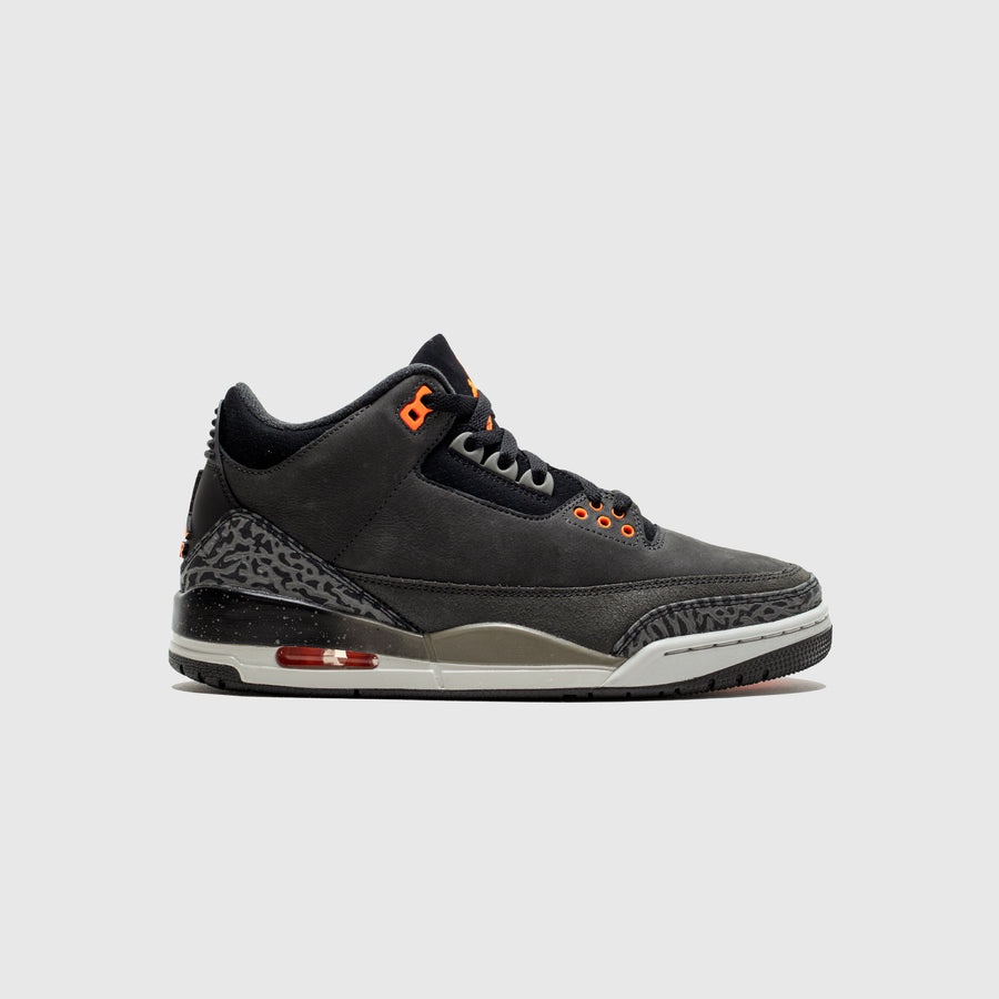 - CT8532 080 - Night Stadium/Total Orange-Black - The Fear colorway of the Air Jordan 3 Retro returns after a 10-year hiatus. - Night stadium suede upper - "Elephant" print overlays on the toe and the heel - Black suede tongue with embroidered total orange "JUMPMAN" logo - Black perforated suede collar - Black TPU heel panel with total orange "JUMPMAN AIR" branding - Grey and black midsole with"AIR" unit in the heel - Black and Total orangerubber outsole