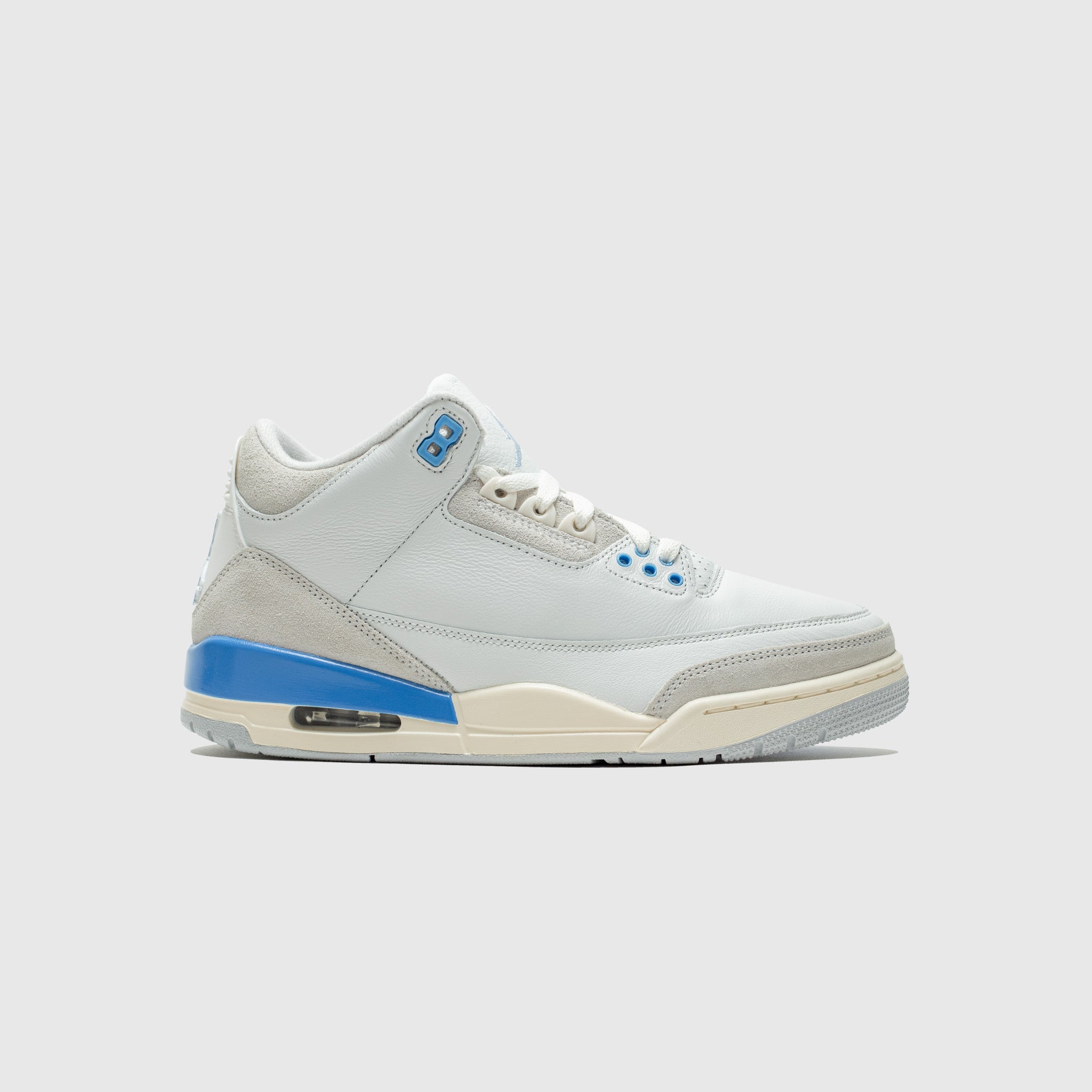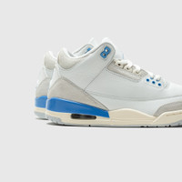 - CT8532 101 - Summit White/Hydrogen Blue-Legend Blue - The Air Jordan 3 Retro "Lucky Shorts" were inspired by the UNC-themed shorts MJ would wear under his Bulls uniform early in his career. - Summit white leather upper - Pure platinum suede overlays on the toe and the heel - Summit white perforated leather tongue with embroidered Legend blue "JUMPMAN" logo - Pure platinum suede collar - Summit white TPU heel panel with "JUMPMAN AIR" branding - Sail foam midsole with black accents and "AIR" unit in the heel - Neutral grey rubber outsole