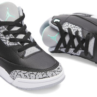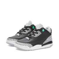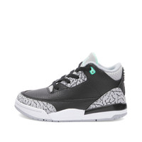 The "Green Glow”, last spotted in 2013, is making a grand comeback after 10 years, now flourishing in the newest chapter of AJ3 and this big kids version. This lively colour scheme breathes new life into the classic “Black Cement” colourway. The fusion of black and grey is punctuated by splashes of green on eyestays, the tongue lining, and the iconic Jumpman logo at the heel. Retaining the distinct style of its celebrated '88 release, the main black tumbled leather upper is embossed with a plush black-on-gray elephant print texture. To top it off, you'll see the familiar Nike Air nestled in the sole, promising a comfy stride with every step. - Genuine & Synthetic Leather Upper - Nike Air Sole Heel Unit - Foam Midsole - Rubber Outsole - Style Code: DM0967-031