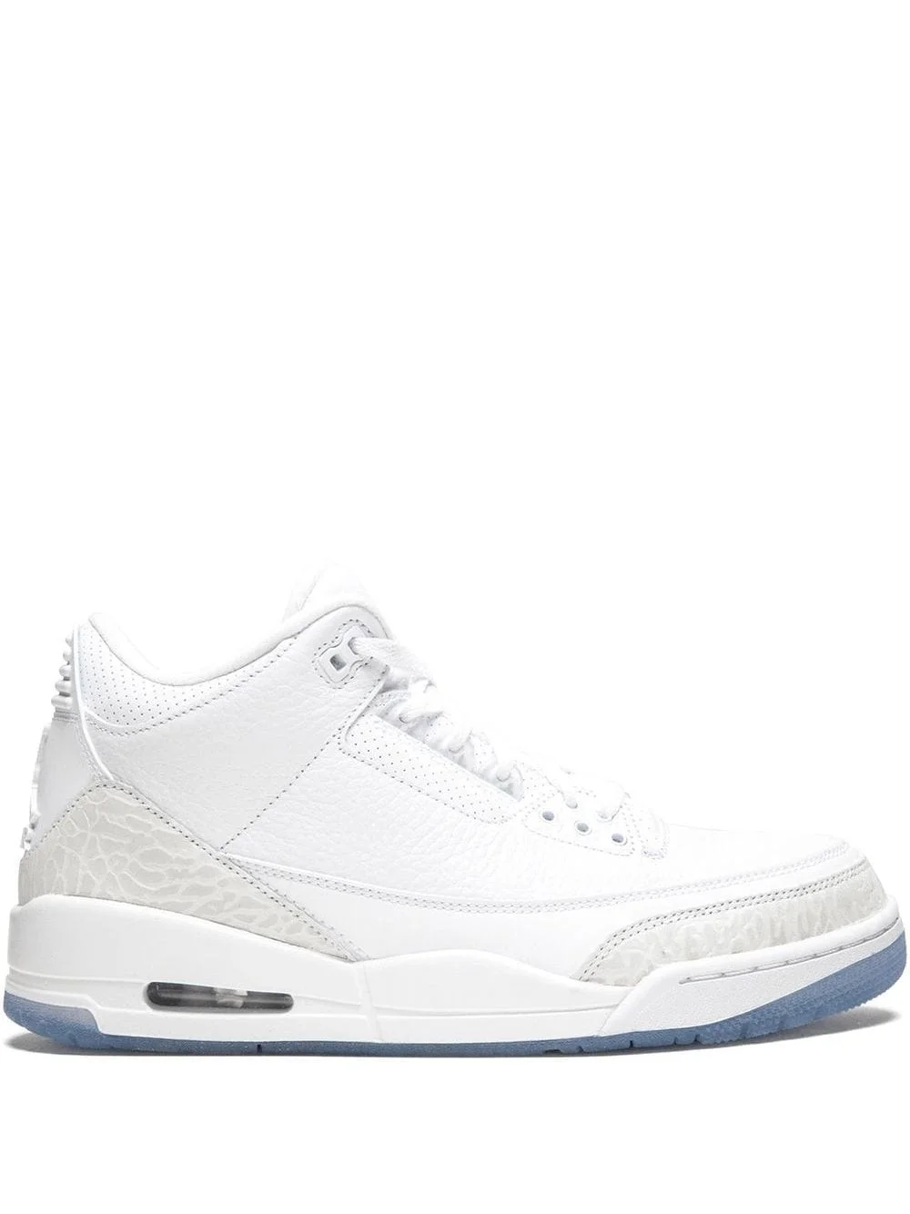 Air Jordan 3 Retro "Pure White" sneakers The Air Jordan 3 Retro "Pure White" sneakers by Jordan Brand feature a clean all-white colour scheme. This model features a leather upper, enhanced with white elephant print panelling, and sits atop an icy blue outsole for contrast. Highlights - White - Leather - Signature jumpman motif - Round toe - Front lace-up fastening - Branded insole - Rubber sole - These styles are supplied by a premium sneaker marketplace. stocking only the most sought-after footwear, they source and curate some of the most hard to find sneakers from around the world. Made in Italy Composition Outer: Calf Leather 100% Lining: Calf Leather 100% Sole: Rubber 100%