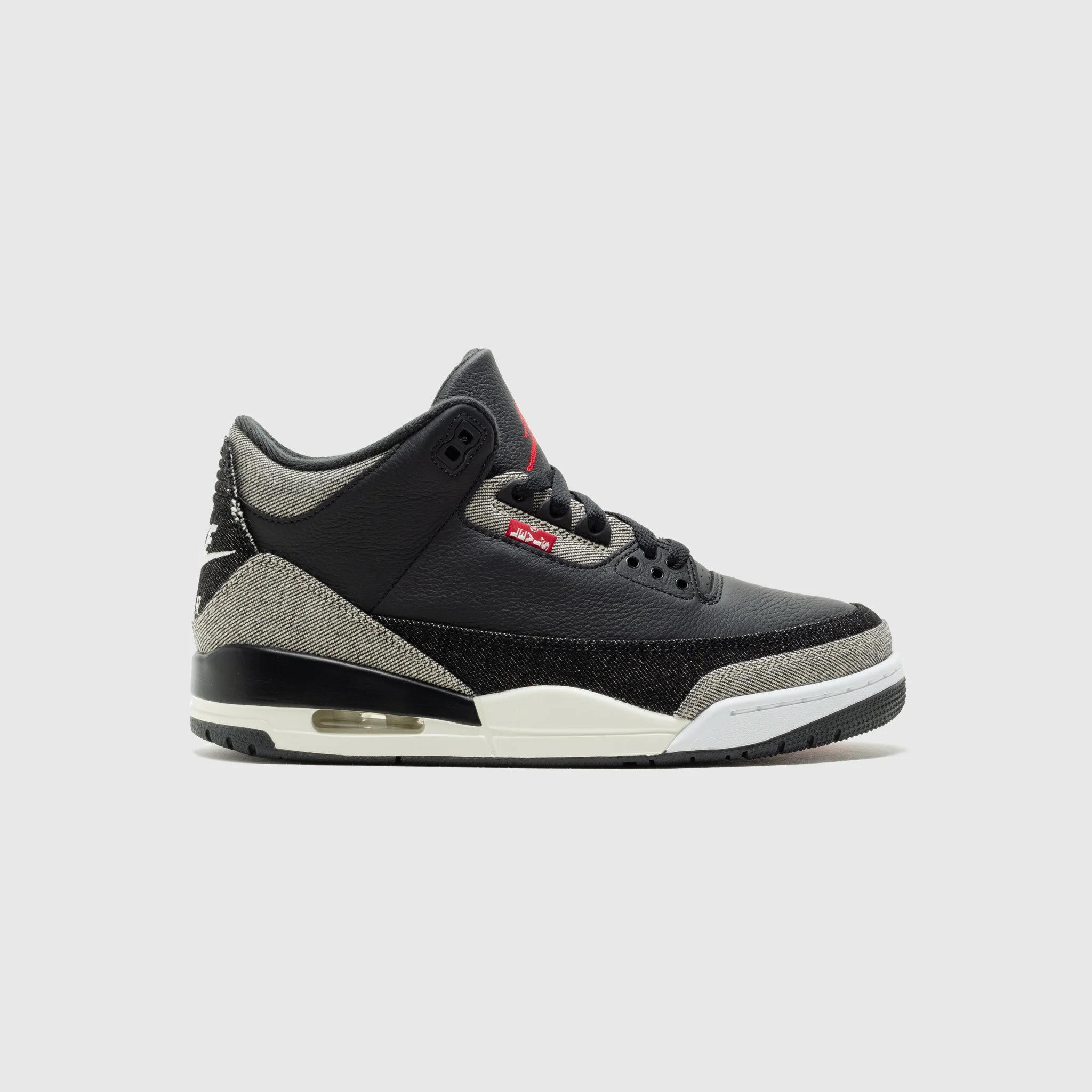 - IR0914-400 - Denim/Black-Gym Red - Levi's and Nike are on an undeniable run after four colorways of the Air Max 95 OG last year, and now a capsule with Jordan Brand, including two colorways of the legendary Air Jordan 3. - Black leather upper - Denim overlays on the toe and the heel - Black leather tongue with a Red embroidered "JUMPMAN" logo - Denim collar - Black Denim heel panel with "NIKE AIR" branding - Sail and Black foam midsole with "AIR" unit in the heel - Black rubber outsole