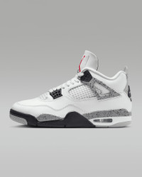 Step into a classic. This AJ4 throws it back with full-grain leather and premium textiles. Iconic design elements from the original, like floating eyestays and mesh-inspired accents, feel just as fresh as they did in '89. Benefits - Nike Air technology absorbs impact for cushioning with every step. - Rubber in the outsole gives you everyday traction. Product Details - Shown: Summit White/Cement Grey/Black/Fire Red - Style: FV5029-100