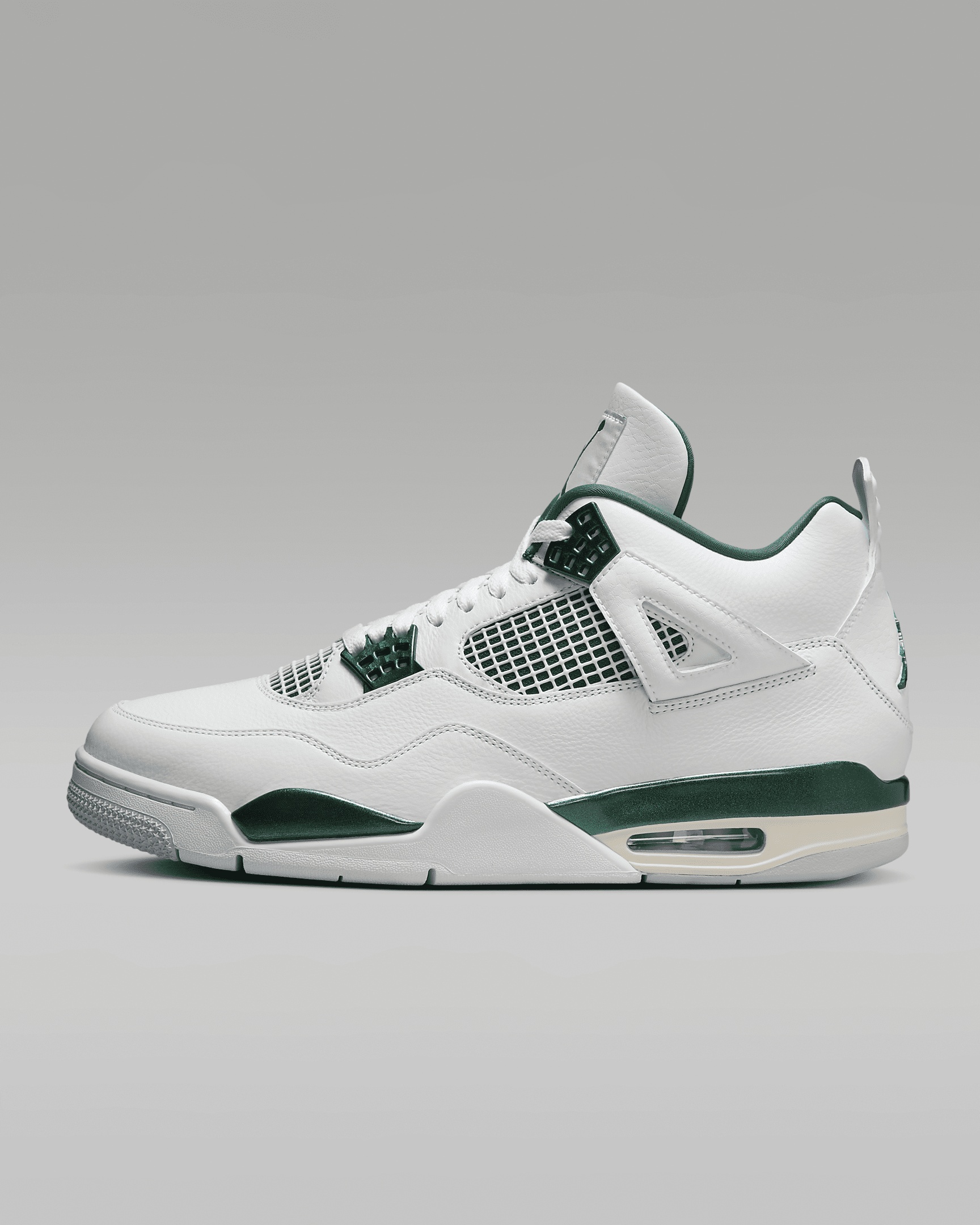 Step into a classic. This AJ4 throws it back with full-grain and synthetic leathers and premium textiles. Lush colors and metallic pops update the icon, while original design elements—like floating eyestays and mesh-inspired accents—feel just as fresh as they did in '89. Benefits - Full-grain and synthetic leathers in the upper make for a durable shoe. - Free-floating eyestays at the ankle pull down over your foot when you lace up. - Nike Air technology absorbs impact for cushioning with every step. - Rubber in the outsole gives you everyday traction. - Shown: White/White/Neutral Grey/Oxidized Green - Style: FQ8138-103