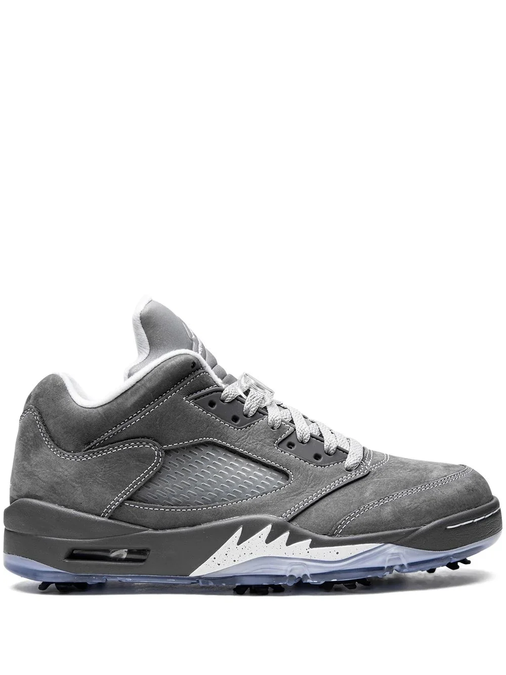 Jordan V Low Golf "Wolf Grey" sneakers The Nike Air Jordan V Low golf shoes now arrive with a full-grey design highlighted with a white Jumpman logo on the tongue. Completing the look is the icy translucent spiked outsole with artificial ground studs underneath. Highlights - Grey - Suede - Signature jumpman motif - Contrasting panel detail - Round toe - Front lace-up fastening - Branded insole - Rubber sole - Artificial ground studs - These styles are supplied by a premium sneaker marketplace. stocking only the most sought-after footwear, they source and curate some of the most hard to find sneakers from around the world. Imported Composition Suede 100%