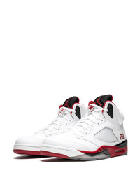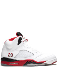 Air Jordan 5 Retro "Fire Red" sneakers Get red-y to run. Crafted from white and fire red leather, these Air Jordan 5 Retro fire red are all you need to get hot stepping. Simply lace up and head out for the day knowing you'll be comfortable and stylish. Highlights - White/red - Leather - Round toe - Flat rubber sole - Front lace-up fastening - Branded insole - These styles are supplied by a premium sneaker marketplace. stocking only the most sought-after footwear, they source and curate some of the most hard to find sneakers from around the world. Imported Composition Outer: Calf Leather 100% Sole: Rubber 100%