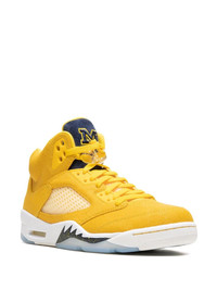 Air Jordan 5 Retro PE sneakers Inspired by the Michigan Wolverines football squad, these Air Jordan 5 Retro PE sneakers come in the institution’s trademark ‘Maize Yellow’ hue. This pair is crafted from suede and features Michigan’s block ‘M’ logo embroidered on the navy suede tongues while, underneath, an icy outsole finishes the look. Imported Composition Outer: Suede 100% Sole: Rubber 100%