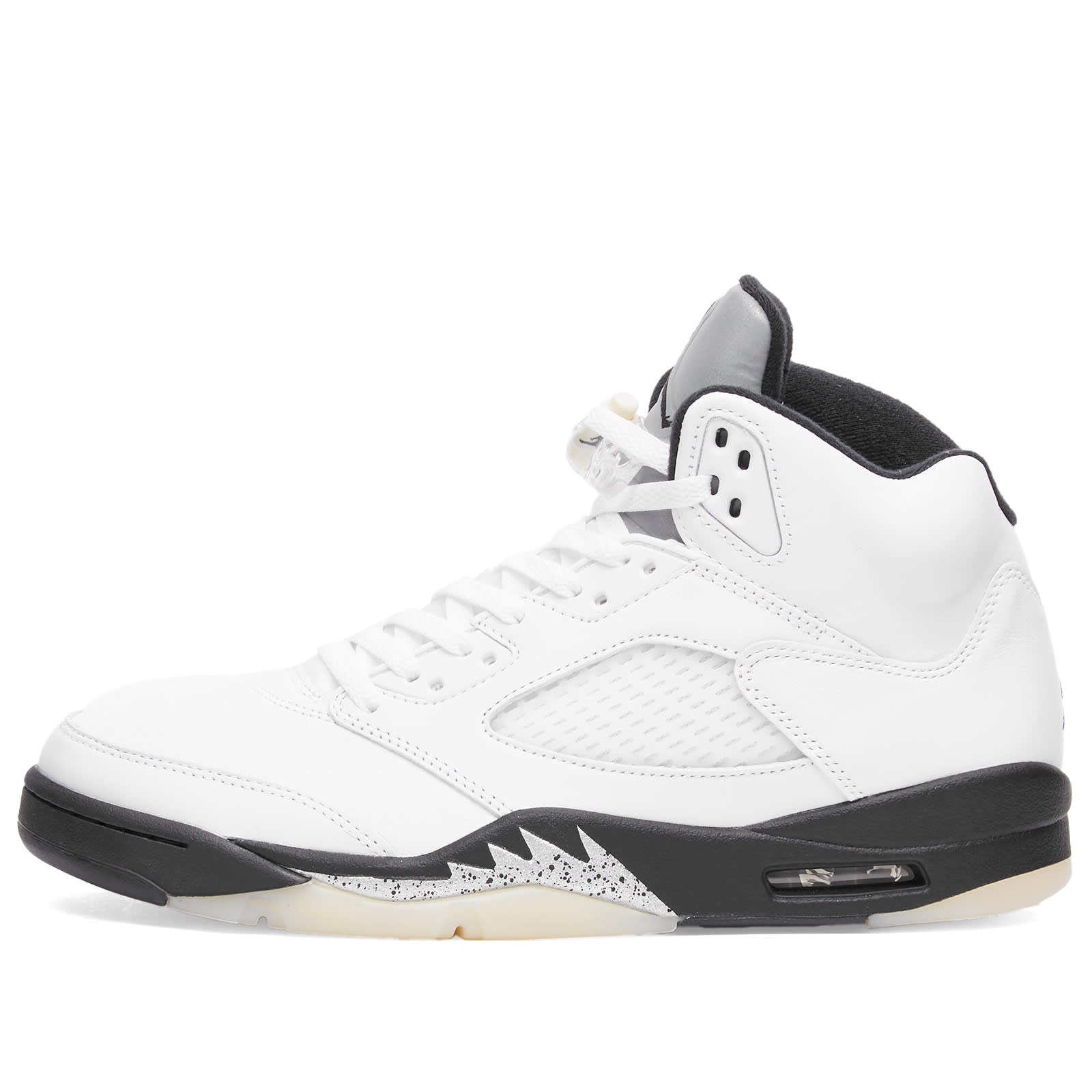 Air Jordan continues to dominate the sneaker world, combining iconic b-ball design with modern technology. This Air Jordan 5 Retro "White Black" sneaker (aka AJ5 'Reverse Metallic') delivers a clean, contemporary aesthetic with its dominating white leather upper, metallic silver accents, and speckled shark tooth details. It’s finished off with reflective Jumpman branding and a transparent lace lock, making it a must-have for any sneakerhead. - Leather Uppers - Air-sole Heel Unit - 3M Reflective Detail - Rubber Outsole