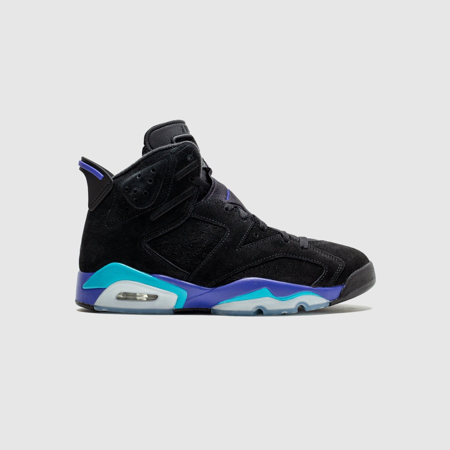 - CT8529 004 - Black/Bright Concord-Aquatone - Grafting an OG colorway from the Air Jordan 8, the Air Jordan 6 Retro "Aqua" gives the landmark model a new look - Black nubuck upper with perforated side panels - Black neoprene tongue with lace cover and TPU top - Embroidered Bright concord "JUMPMAN" logo on lace cover - Lace closure with lace locks - TPU heel pull tab - Black embroidered "JUMPMAN" branding on heel - Bright concord and Aquatone midsole with "AIR" unit in the heel - Black and translucent rubber outsole