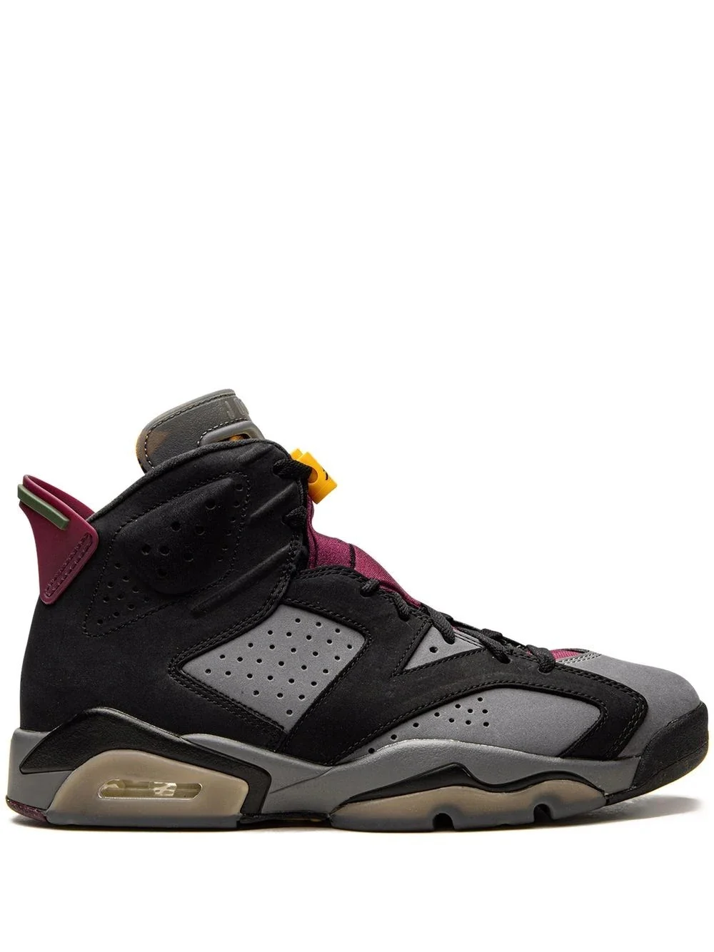 Air Jordan 6 Retro "Bordeaux" sneakers The Jordan 6 is a mix of the classic 'Bordeaux' Air Jordan 7 with a predominantly grey upper that's paired with black panels, and multi-coloured accents on the tongue. Here, the two-toned upper is accompanied by a bordeaux neoprene tongue with a grey and yellow print hitting the upper translucent portion of the tongue. More bordeaux hits the tongue overlay and heel pull tab while both shades of grey hit the midsole and translucent detailing appears on the outsole. Highlights - Grey/black - Leather - Signature jumpman motif - Contrasting panel detail - Round toe - Front lace-up fastening - Ankle-length - Pull-tab at the heel - Branded insole - Rubber sole - These styles are supplied by a premium sneaker marketplace. stocking only the most sought-after footwear, they source and curate some of the most hard to find sneakers from around the world. Imported Composition Leather 100%