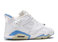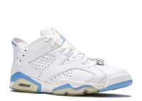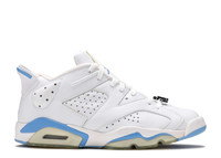 The Air Jordan 6 Retro Low 'University Blue' puts a University of North Carolina colorway on its low-top build. The perforated white upper is highlighted by hits of University Blue on the midsole detailing and heel loop, while an external heel counter supports the fit. A chrome lace lock adds further support, while visible Air in the heel provides cushioning. SKU: 304401 141 Colorway: White/University Blue Release Date: 4/27/02