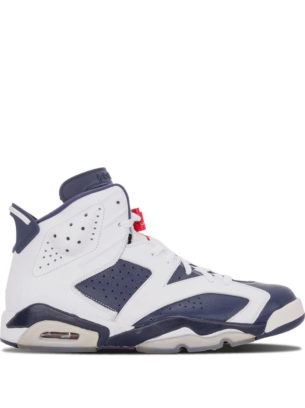 Air Jordan 6 Retro "Olympic" sneakers First debuted during the 2000 Summer Olympics on the feet of Ray Allen and Vin Baker. These Air Jordan 6 Retro "Olympic" sneakers were released in 2012 after much anticipation for their midnight blue and varsity red colourway. Finished with perforated panels throughout, the high-top pair are sure to have you scoring high. Featuring an almond toe, a lace-up front fastening, a toggle fastening, a brand embossed tongue, a branded insole, a padded ankle, a perforated detail, a pull tab at the rear, branded heel counter and a signature Nike Air sole. Imported Composition Calf Leather 100%