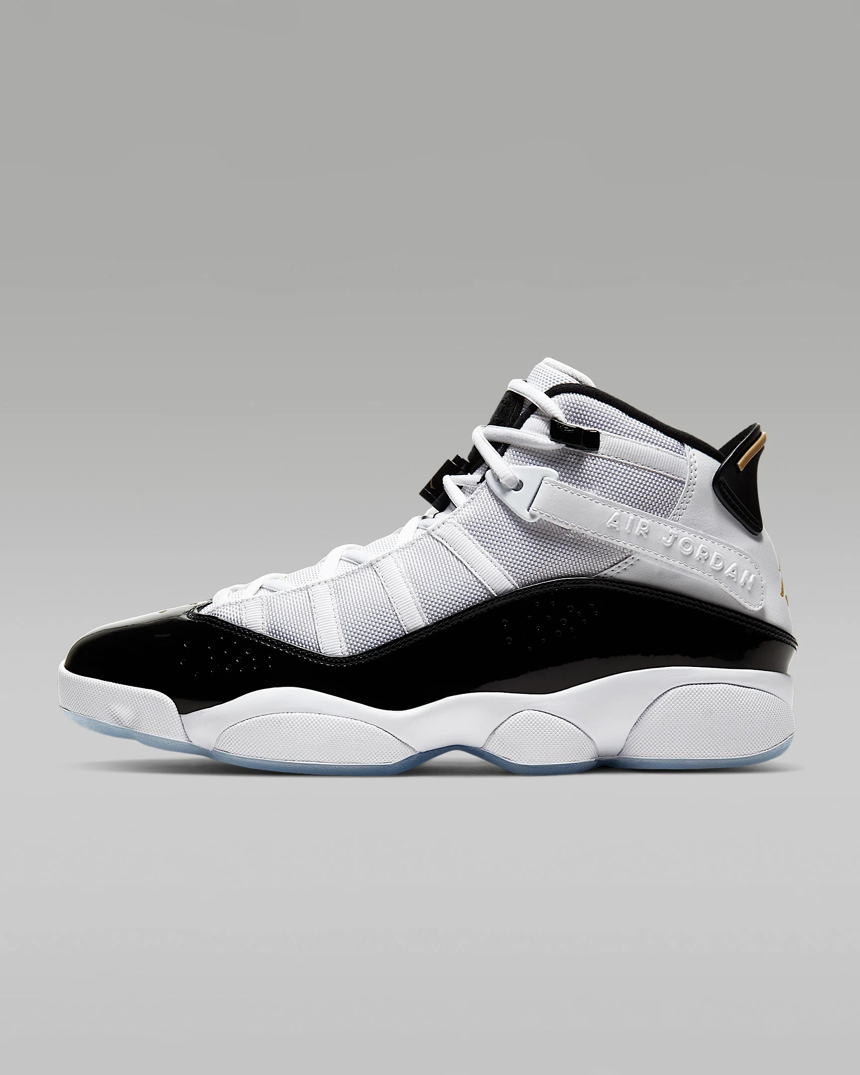 Pay homage to MJ's career in the Jordan 6 Rings. The design pulls in elements from a range of iconic AJs, like the patent leather mudguard from the AJ11 and the outsole and midsole sculpting of the AJ13. Benefits - Genuine leather, synthetic leather and textile materials in the upper combine for lightweight durability. - Nike Zoom Air units and a foam midsole offer soft, responsive cushioning. - Hook-and-loop strap adjusts the fit. Product Details - Gold-tone lace tips - Jumpman design on heel, tongue and sockliner - Shown: White/Black/Ice/Metallic Gold - Style: CW6993-100