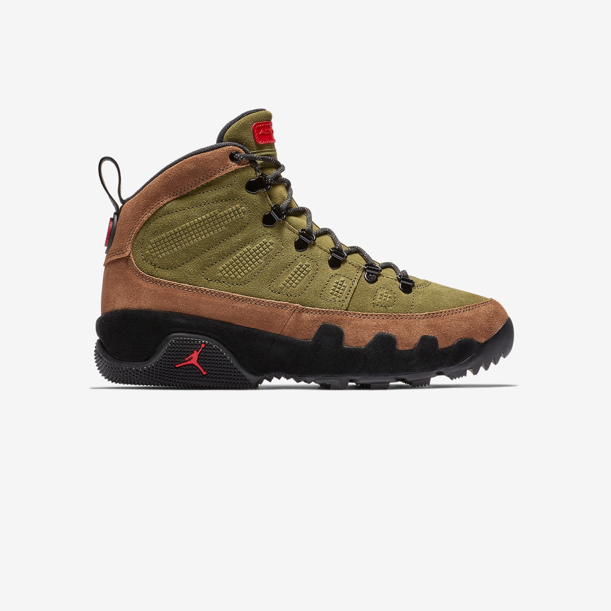 The Air Jordan 9 is one of those kicks that get the love from many collectors, even though it was the sneaker Michael Jordan never played in. The Tinker-designed and non-played MJ signature sneaker was released during his baseball detour and is now returning in a “MILITARY BROWN” colorway. - Brand Jordan Air Jordan 9 Retro MILITARY BROWN/LEGION GREEN - Leather upper with suede leather overlays - Inner sock for better fit - Embroidered branding at the heel - Heel pull for faster on and off - Air cushioning - Rubber outsole Article no. AR4491-200 Gender: MEN Color: MILITARY BROWN/LEGION GREEN