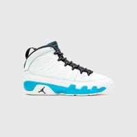 - FQ8992 101 - Summit White/Black-Dk Powder Blue - Celebrating 30 years, the Air Jordan 9 Retro returns in a Powder Blue colorway. - Summit white leather upper - Black stretch mesh bootie with "AIR JORDAN" tongue tag - Black TPU lace loops - Black heel pull tab with Powder blue TPU "WORLD JUMPMAN" - Powder blue foam midsole - Summit white rubber outsole with black "JUMPMAN" logo