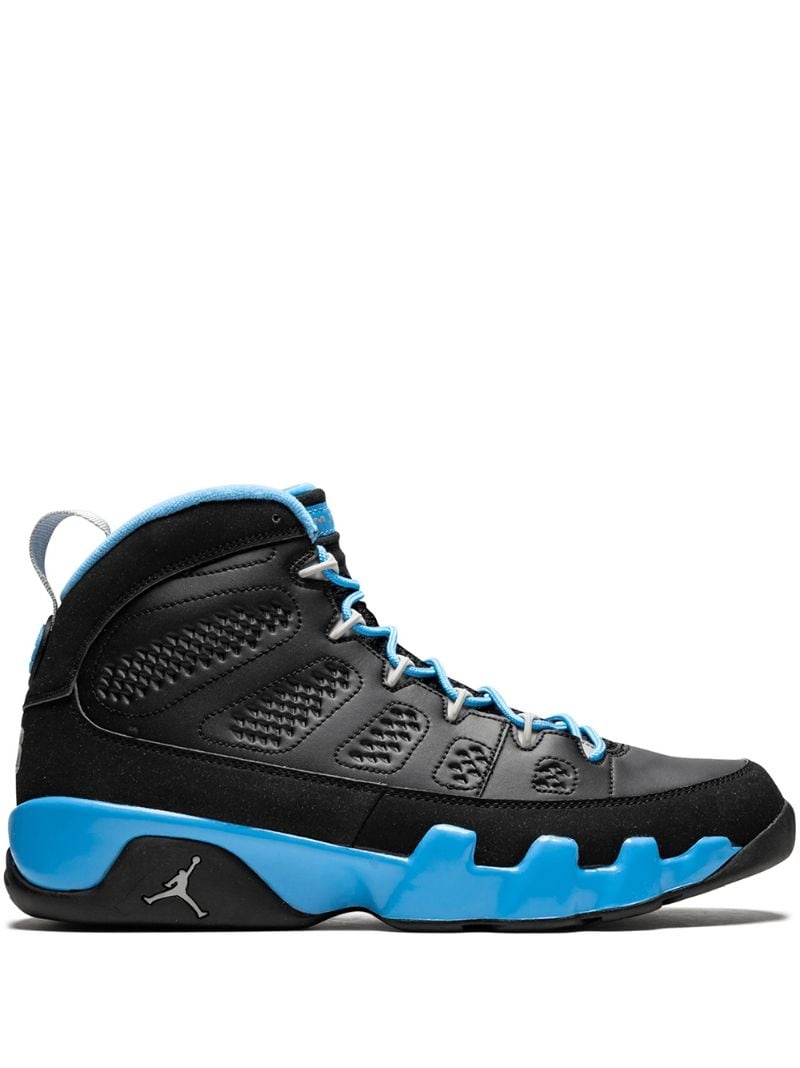 Air Jordan 9 retro sneakers Nike had some fun with Jordan’s retirement in 1994, creating the “Johnny Kilroy” ad campaign that suggested he hadn’t retired from the game after all. In 2012 Jordan Brand created a retro Air Jordan 9 pack referencing each of the suspicious characters from the commercial series, including this Slim Jenkins version in black with light blue accents. Imported Composition Lining: Polyester 100% Outer: Leather 100% Sole: Rubber 100%