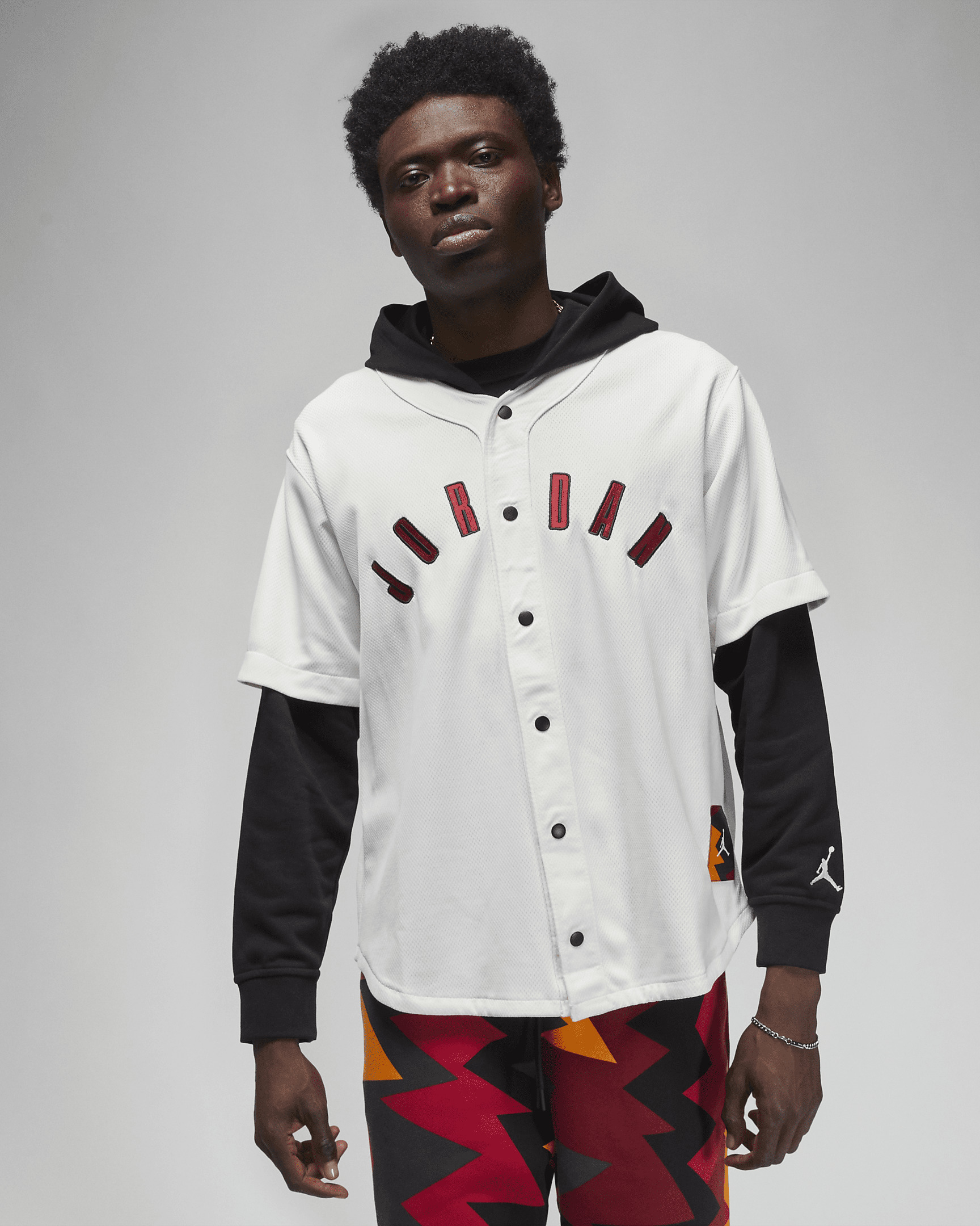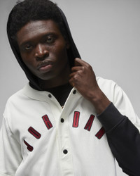 Layer up to stand out. This top features sweatshirt sleeves and a hood attached to a mesh jersey for a two-piece look without the bulk. Embroidered graphics and a woven label add some subtle spice. Benefits - Two-piece hood is roomy and comfortable. - Ribbed cuffs keep cold out. Product Details - Body: 58% cotton/42% polyester. Panels: 80% cotton/20% polyester. Hood Lining: 100% cotton. - Jordan Jumpman branding - Machine wash - Imported - Shown: Sail/Black/Sail - Style: FB7034-133 SIZE & FIT Model is wearing size M and is 6′2″188cm Standard fit: easy and traditional