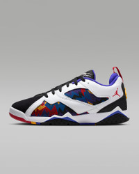 How do you top the AJ7? You reimagine it with a low-top silhouette. We started with the layered upper and iconic midsole that turned the original into an instant classic. Then we added textile accents and a padded, low-cut collar to give you a fresh, modern look. Benefits - Real and synthetic leather adds durability and structure to the upper. - Nike Air technology absorbs impact for cushioning with every step. - Foam midsole adds lightweight cushioning. - Rubber outsole gives you durable traction. Product Details - Pull tab on heel - Foam midsole - Perforations on sides - Shown: White/Black/Bright Concord/Laser Orange - Style: IM6570-100